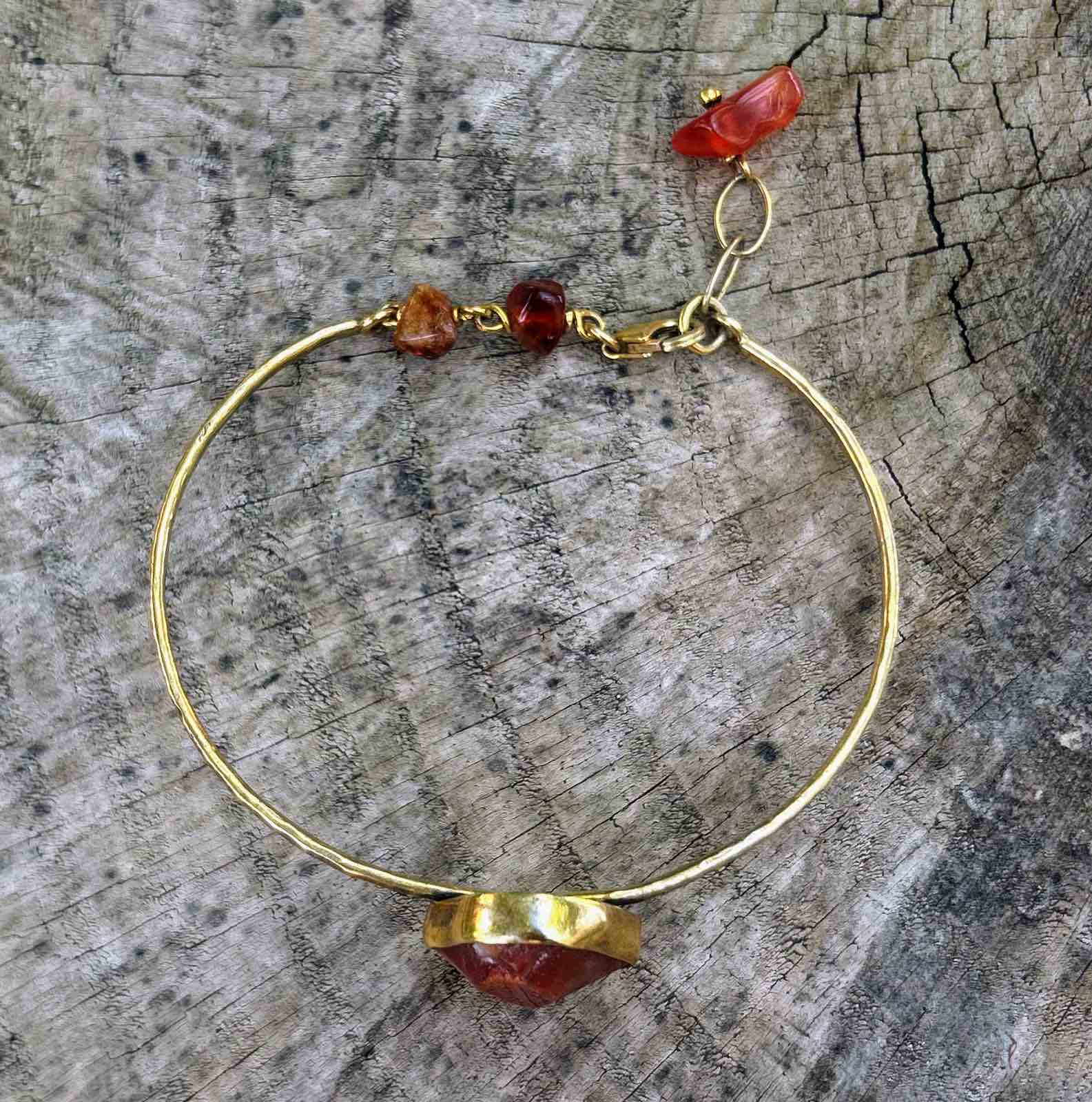 Ένα κομψό και μοναδικό βραχιόλι βέργα, φτιαγμένο από επιχρυσωμένο ασήμι 925, διακοσμημένο με μία φυσική, ακατέργαστη κορνεόλη αγκαλιασμένη μέσα σε χειροποίητο καστόνι. Το λεπτεπίλεπτο δέσιμο ολοκληρώνεται με δύο μικρές χάντρες κορνεόλης ροζάριο και μία που αιωρείται απαλά στο τελείωμα, χαρίζοντας μια αίσθηση κίνησης και αρμονίας.