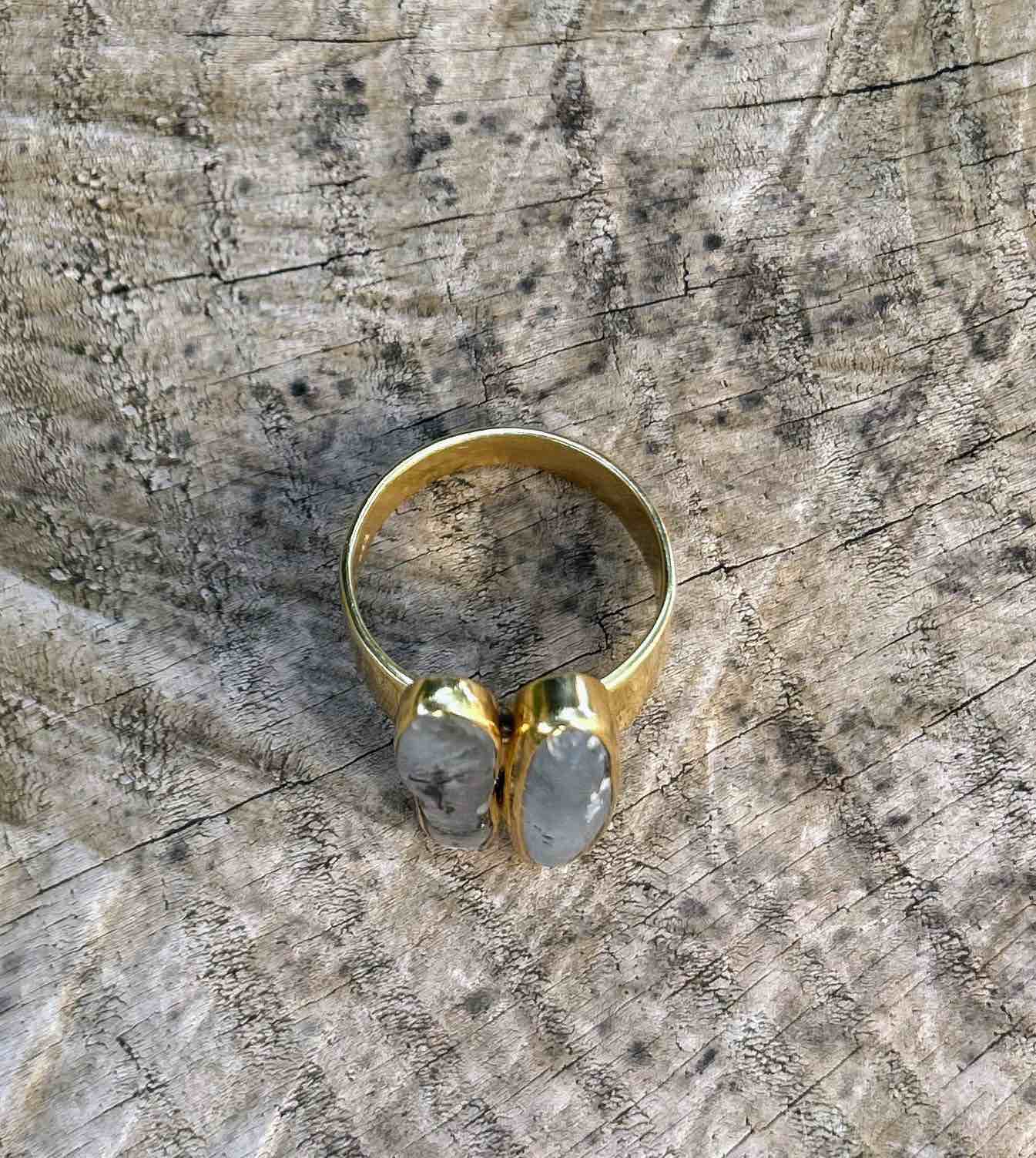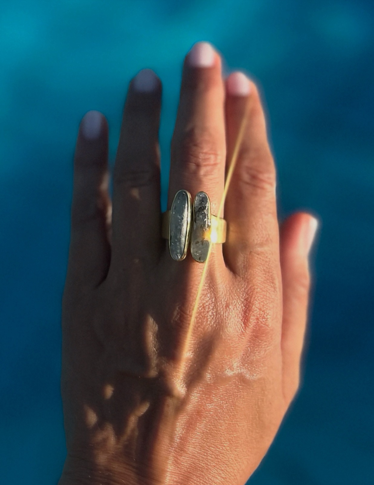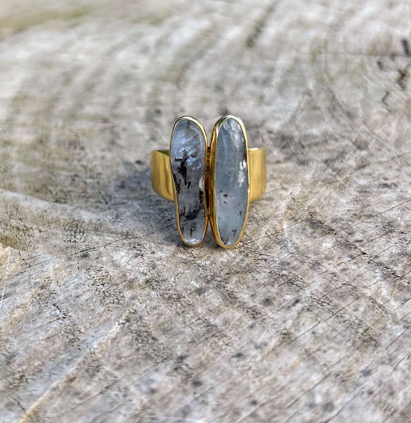 Αναδείξτε το προσωπικό σας στυλ με αυτό το μοναδικό χειροποίητο δαχτυλίδι από ασήμι 925, επιχρυσωμένο με χρυσό 24 καρατίων. Το ιδιαίτερο σχέδιο του κοσμήματος φιλοξενεί δύο επιμήκεις φυσικούς κυανίτες, τοποθετημένους παράλληλα, που προσδίδουν έναν αέρα κομψότητας και γήινης πολυτέλειας.