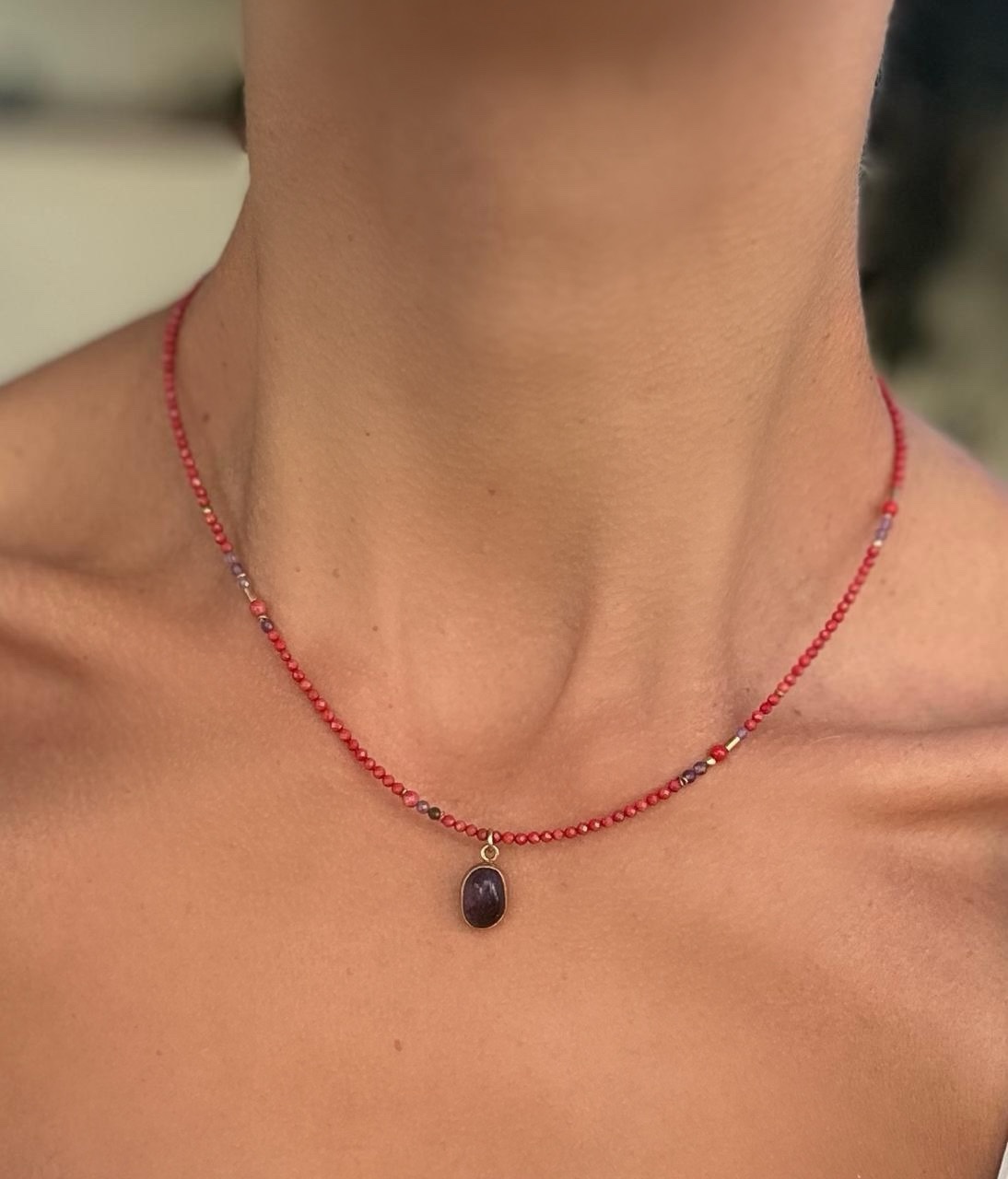 Κοντό κολιέ από κόκκινο κοράλλι με διακριτικές λεπτομέρειες αμέθυστου και επιχρυσωμένο ασήμι 925, που φιλοξενεί στο κέντρο έναν αμέθυστο 8mm, προσφέροντας φυσική ομορφιά, κομψότητα και διακριτική λάμψη για καθημερινές ή ιδιαίτερες εμφανίσεις.