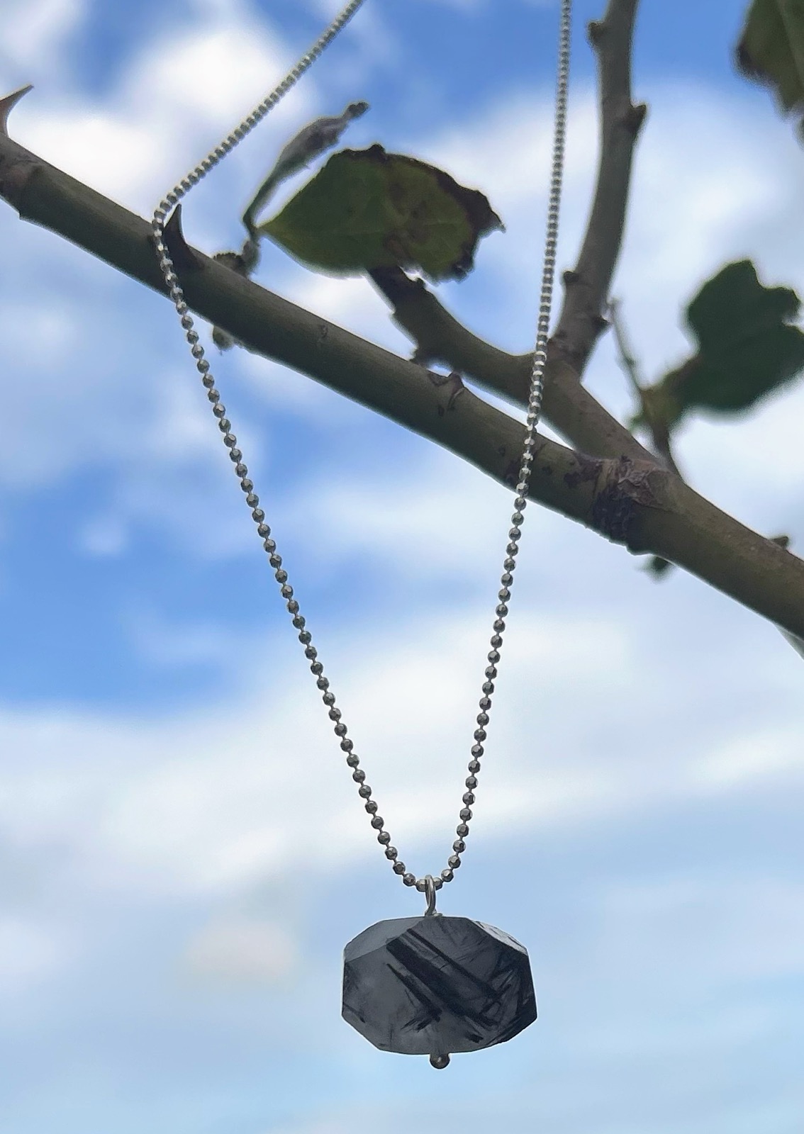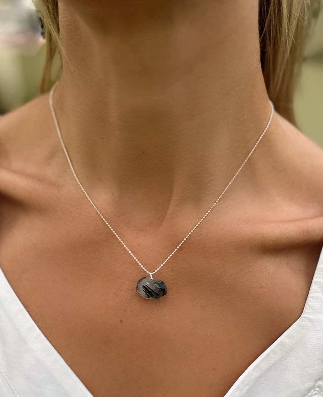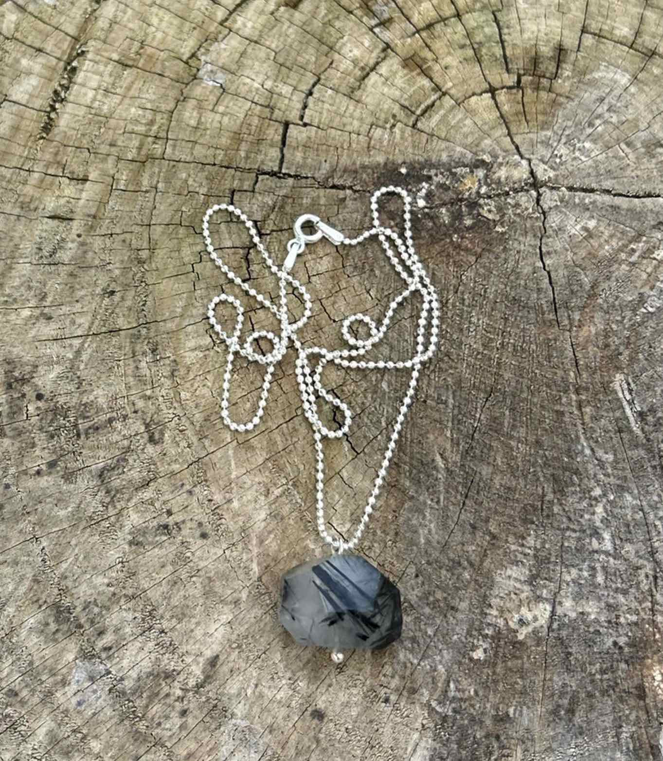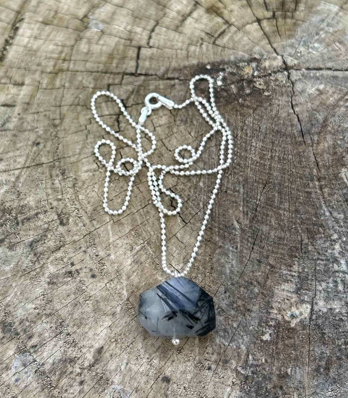 Μενταγιόν από Ρουτίλιο Χαλαζία με έντονες μαύρες ακτίνες και ασημένια αλυσίδα με μπιλάκια. Μοναδικό, δυναμικό και γεμάτο χαρακτήρα.