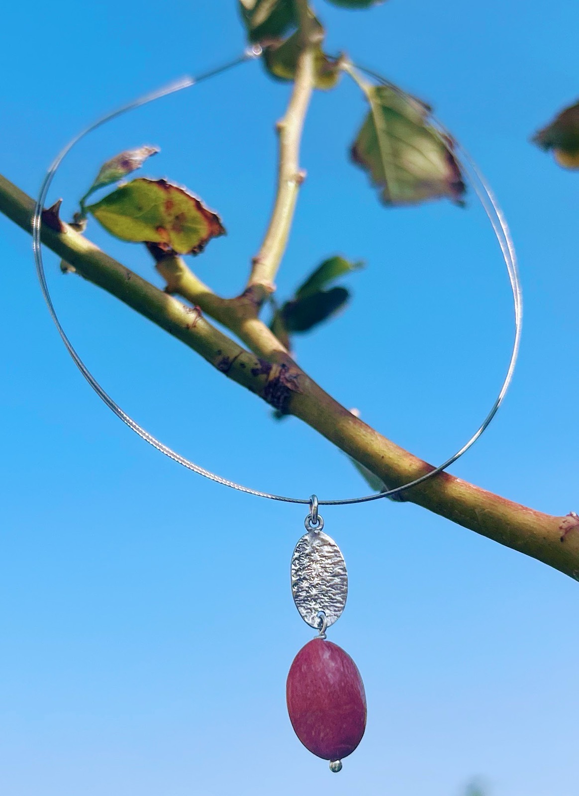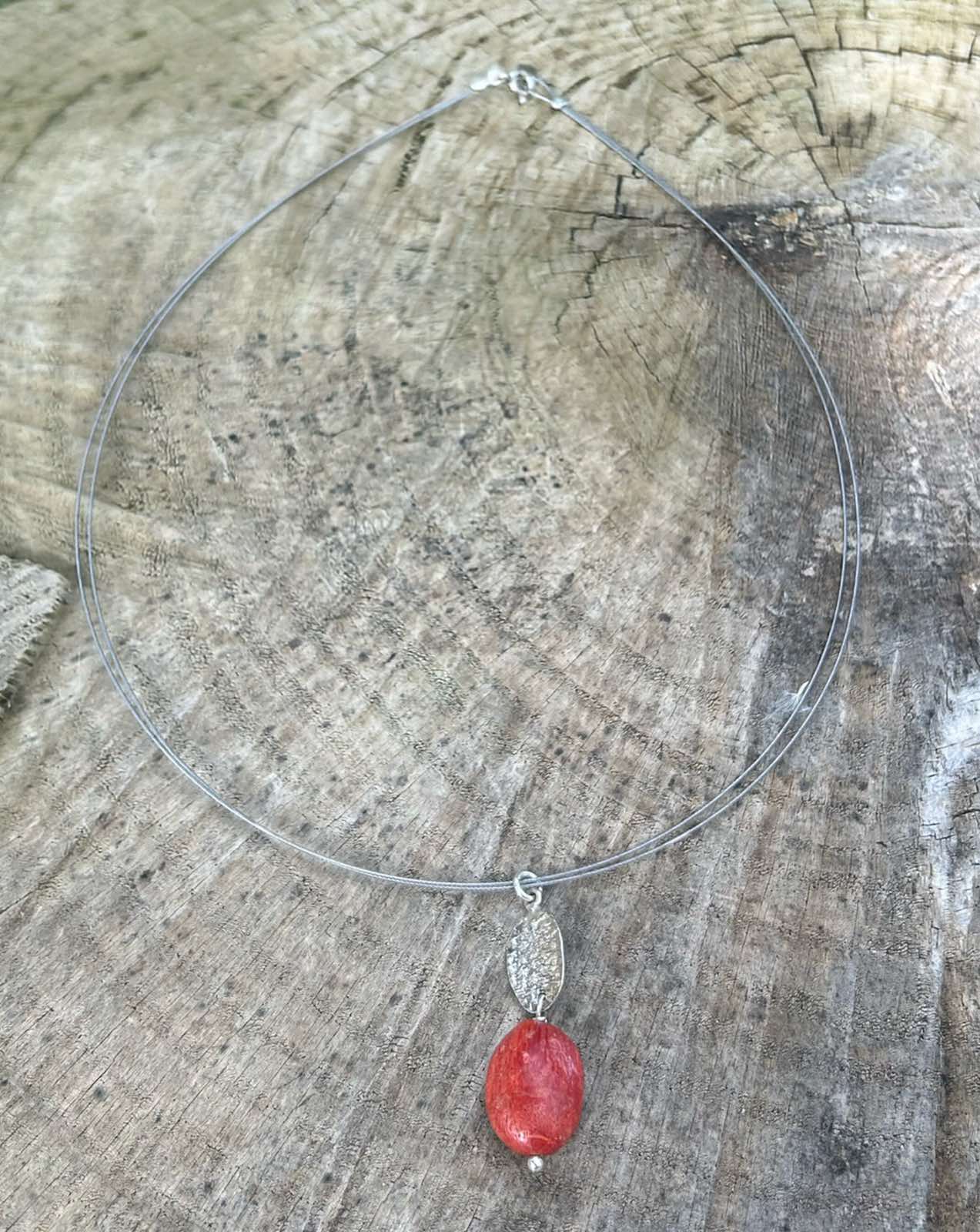 Χειροποίητο μενταγιόν με σφυρήλατο ασημένιο στοιχείο και φυσικό κοράλλι, περασμένο σε διπλό ασημί ατσαλόσυρμα. Το κοράλλι φέρνει ζωτικότητα, αρμονία και θετική ενέργεια, κάνοντας το κόσμημα σύμβολο δύναμης και εσωτερικής ισορροπίας.