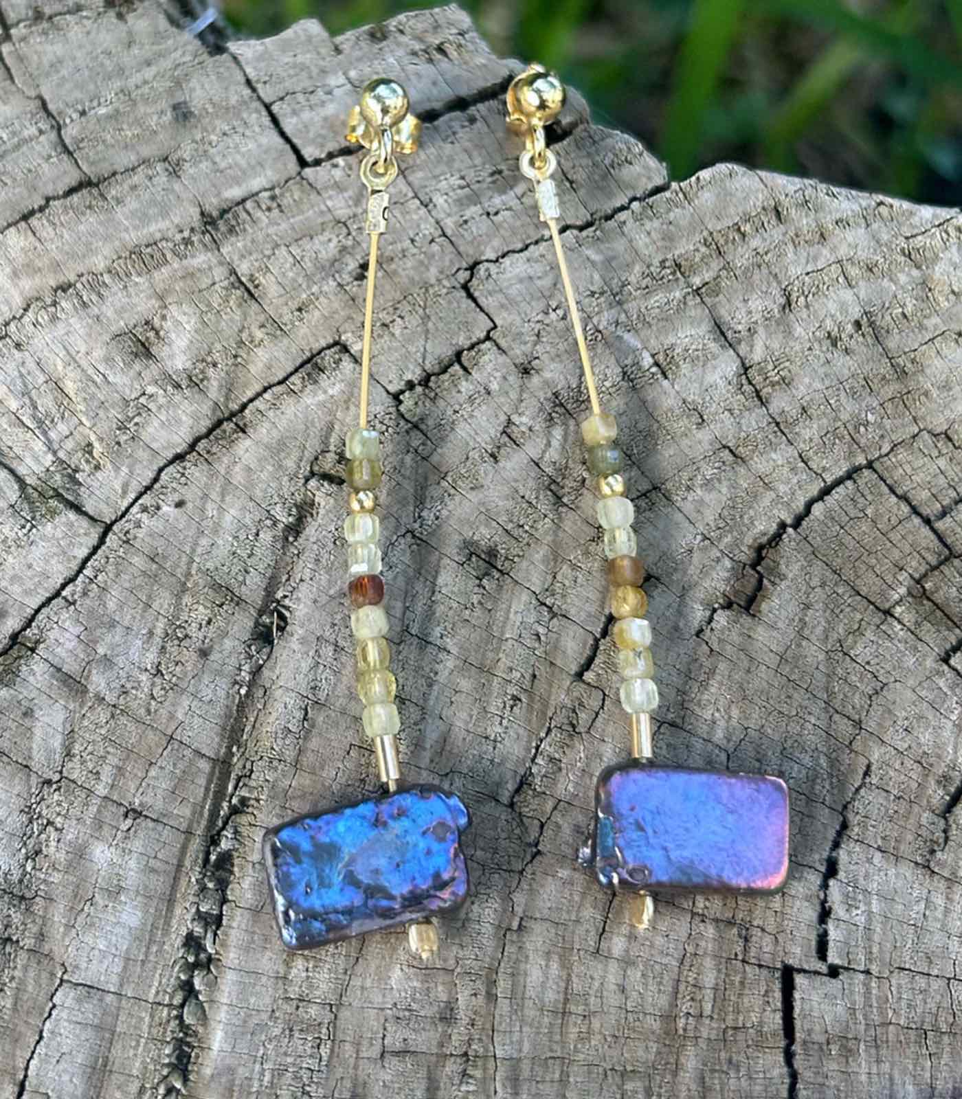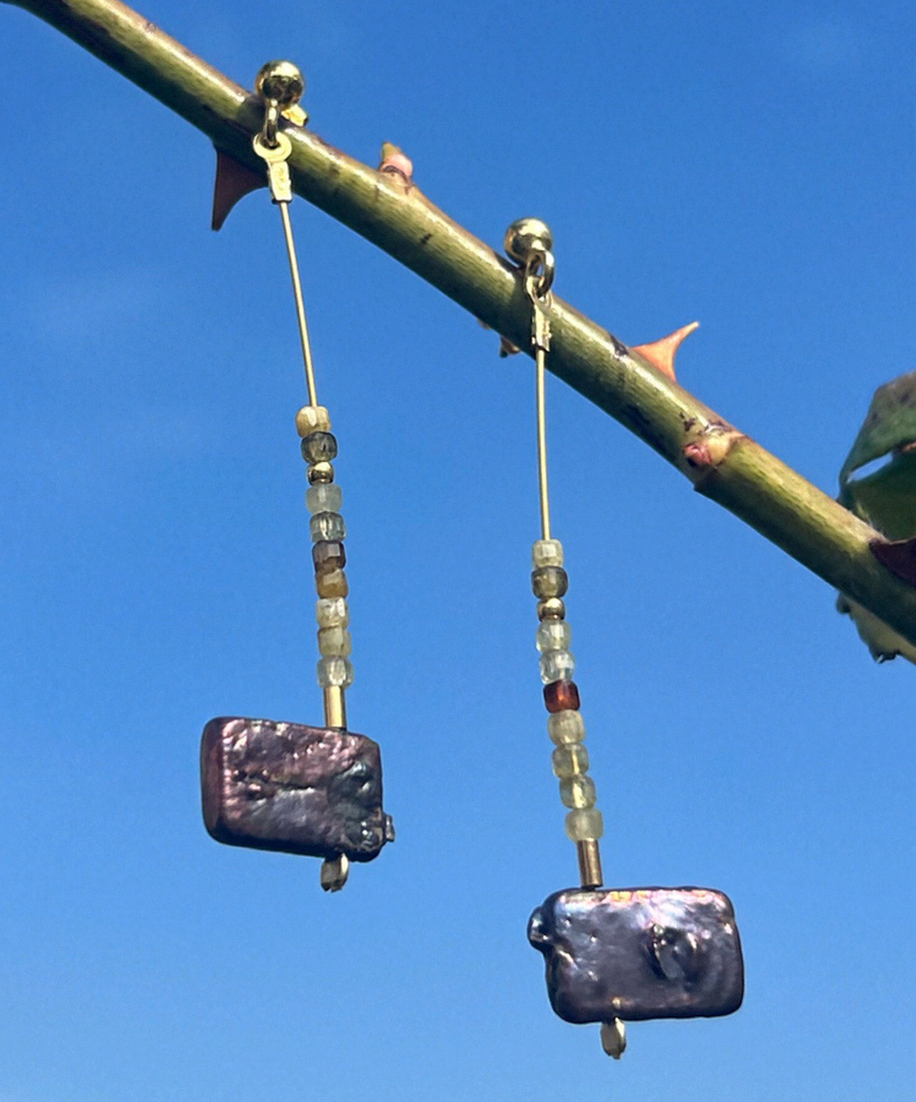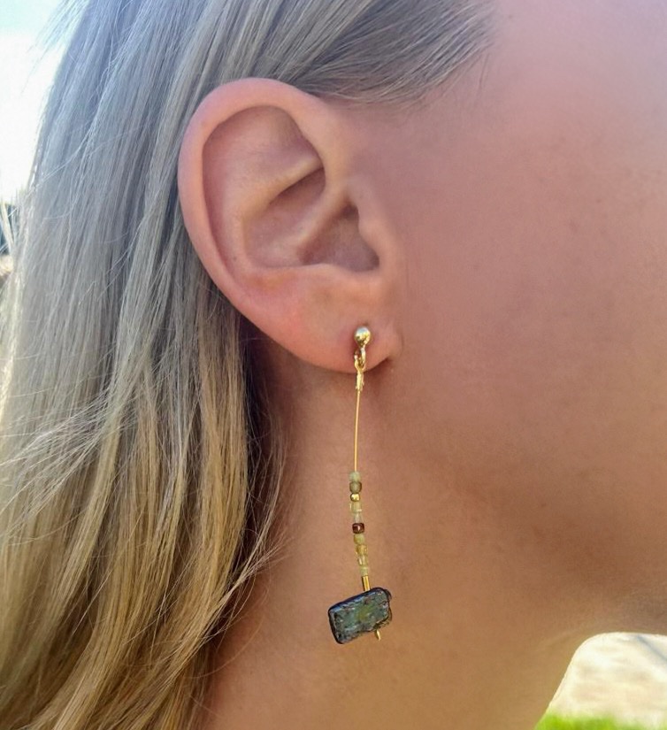 Χειροποίητο ζευγάρι σκουλαρίκια σχεδιασμένο για να αναδεικνύει τη φυσική ομορφιά των πολύτιμων υλικών. Το σκουλαρίκι αποτελείται από λεπτό χρυσό ατσαλόσυρμα, πάνω στο οποίο είναι περασμένοι μικροί πολύτιμοι λίθοι περίδοτου 2mm, χαρίζοντας μια γήινη, φωτεινή και κομψή χρωματική ισορροπία.