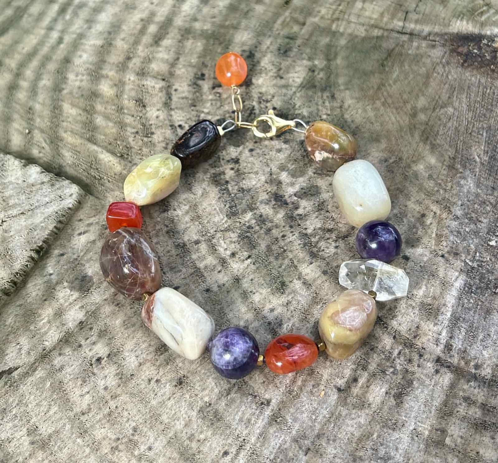 Ένα κομψό, χειροποίητο βραχιόλι που συνδυάζει πέντε ισχυρούς ημιπολύτιμους λίθους, προσφέροντας αρμονία, προστασία και ισορροπία. Ο αχάτης, ο αμέθυστος, ο χαλαζίας, η κορνεόλη και ο μπρονζίτης δημιουργούν έναν μοναδικό χρωματικό και ενεργειακό συνδυασμό, με μικρές λεπτομέρειες από χρυσό αιματίτη ανάμεσα στις πέτρες για διακριτική λάμψη και γείωση. Το κόσμημα ολοκληρώνεται με κούμπωμα από επιχρυσωμένο ασήμι 925, που ενισχύει την ποιότητα και τη φινέτσα του. Στο τελείωμα αναδεικνύεται μία ακόμη κορνεόλη, προσθέτοντας κίνηση και μια καλαίσθητη, χειροποίητη λεπτομέρεια.