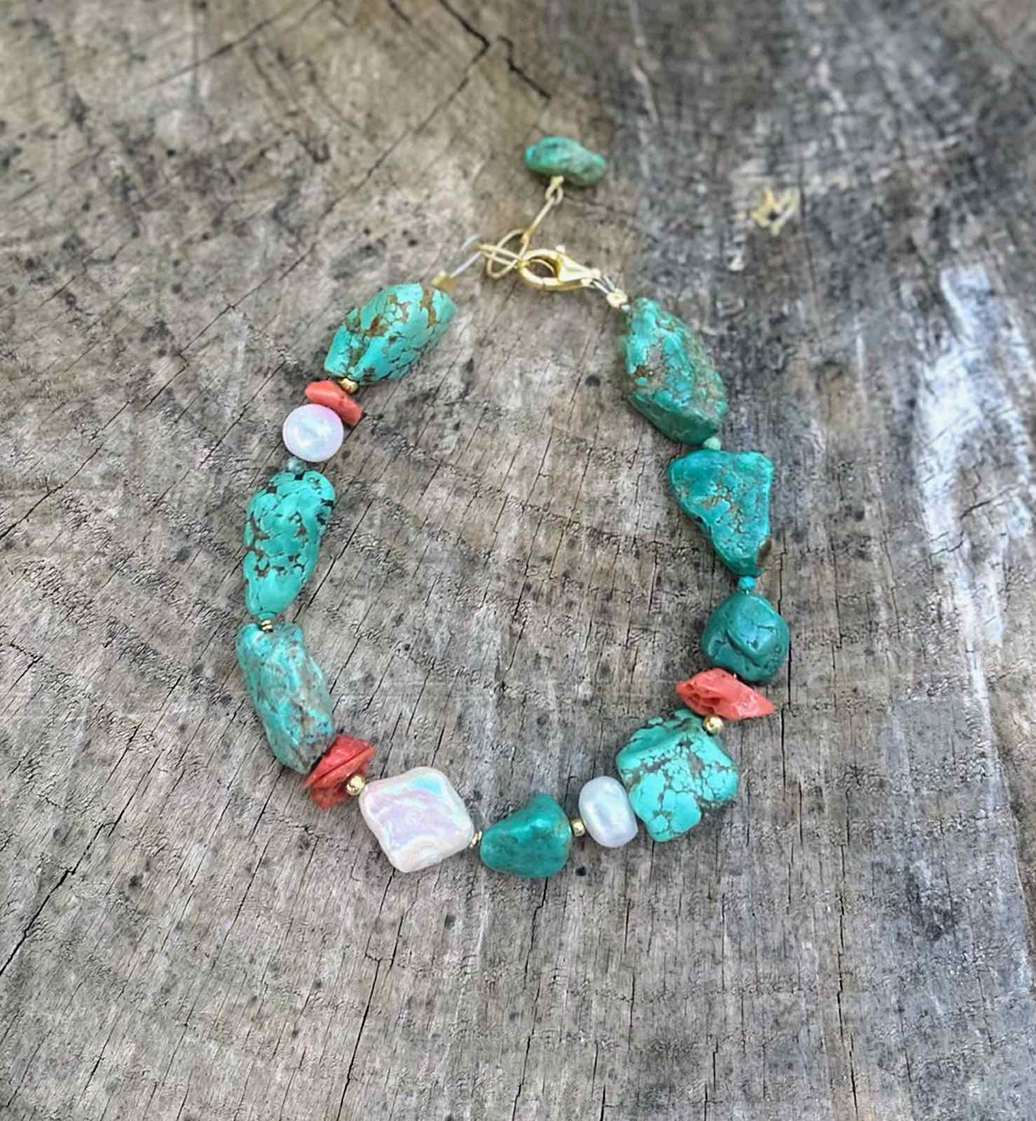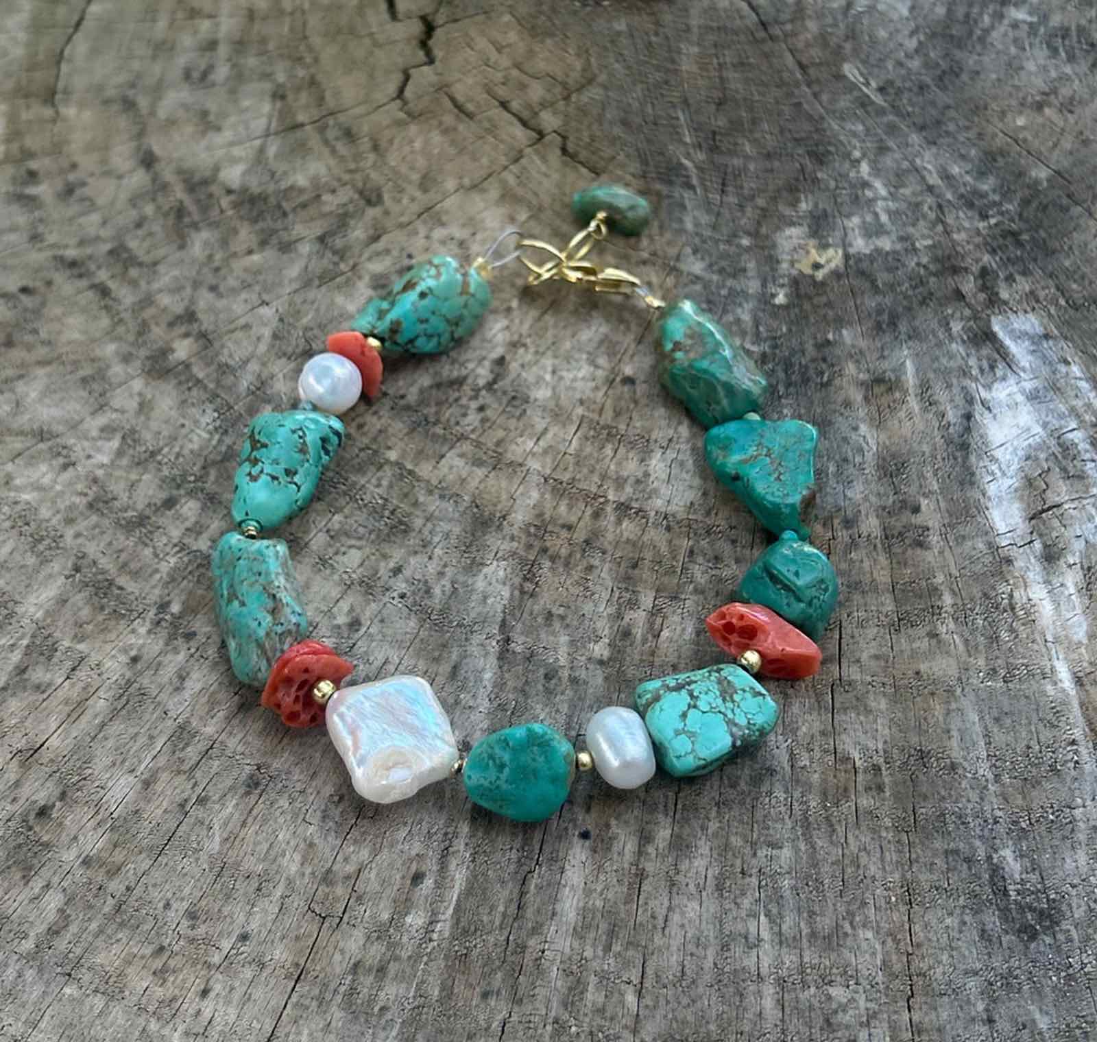 Βραχιόλι με φυσικό ακατέργαστο τυρκουάζ, καλλιεργημένο μαργαριτάρι και κόκκινο κοράλλι